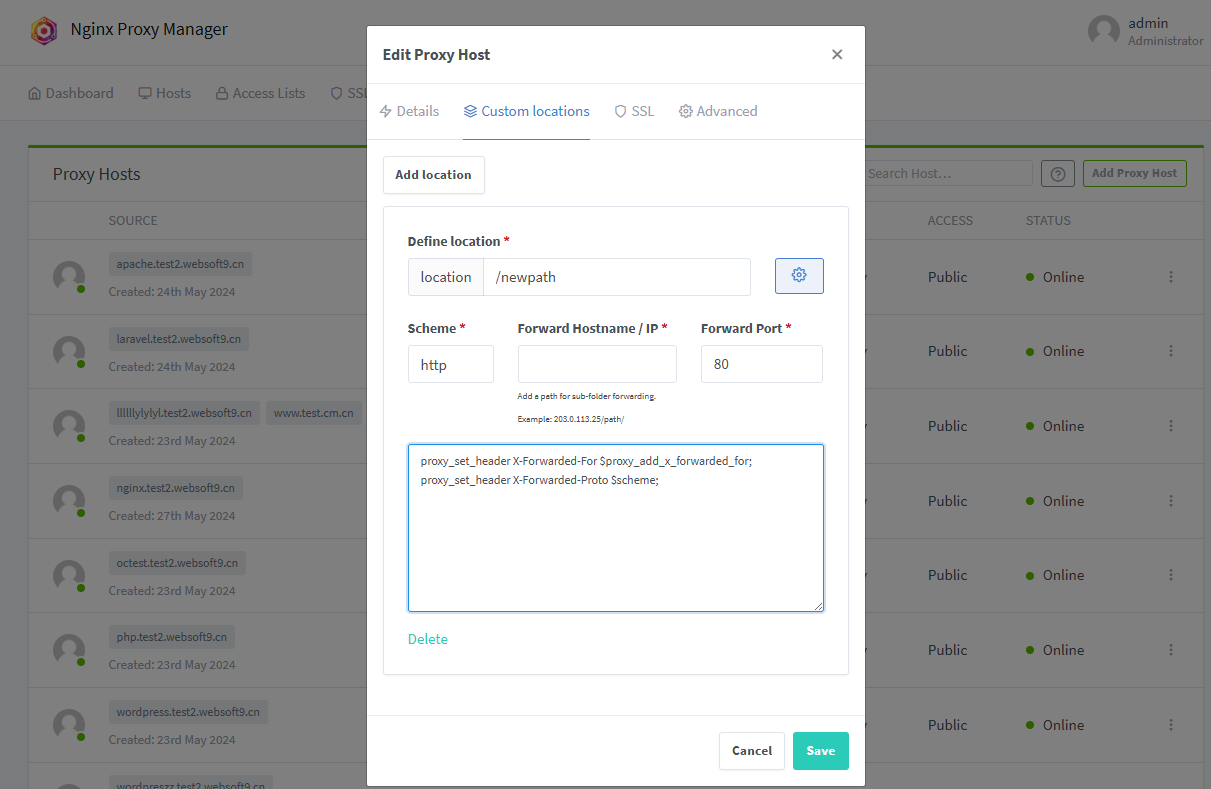 Websoft9 网关管理界面支持对已有的 HTTP 转发增加个性化的 location 设置