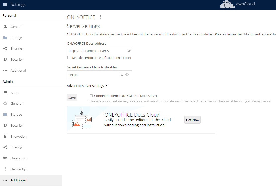 安装完成后,settings > Admin > additional 设置 ONLYOFFICE 连接