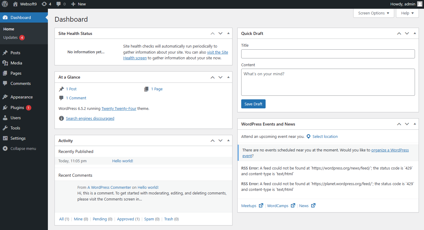 在迁移之前,先通过 Websoft9 应用市场,安装一个全新的 WordPress 应用,此处称之为目的站。