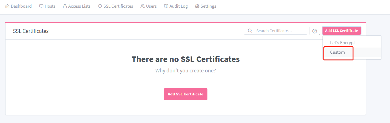 2. Open the Add SSL Certificate > Custom to upload certificates